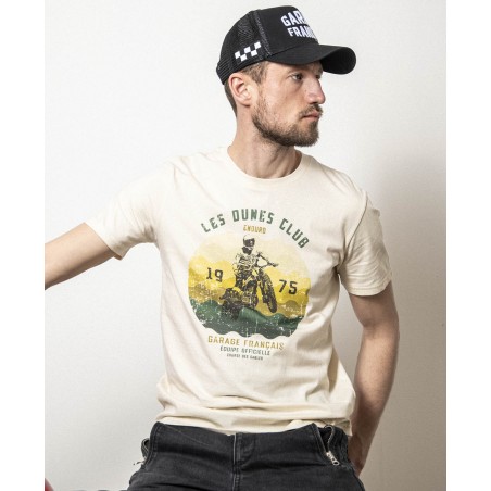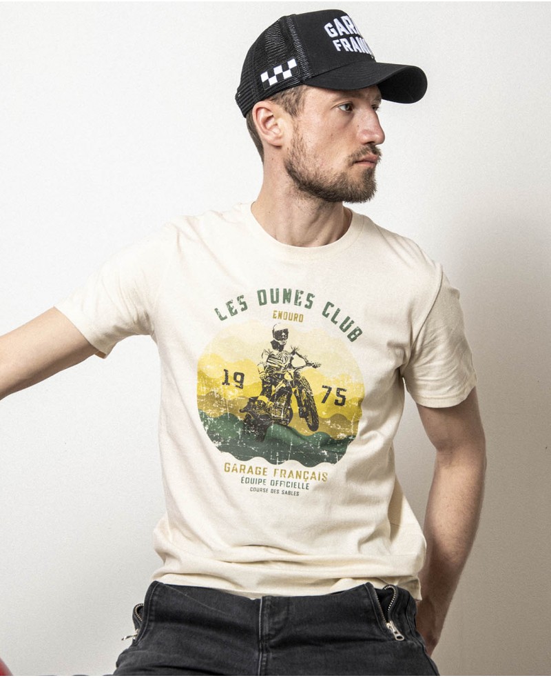 une moto des 70s fend les dunes dans une illustration grand format. Une pièce à porter avec fierté, que vous ayez fini la course… ou juste l'apéro.
